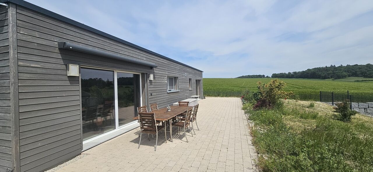La maison dispose d’une cuisine ouverte moderne, parfaitement agencée, qui s’ouvre sur un salon lumineux. Cet espace de vie convivial donne accès à une terrasse et à un jardin offrant une vue panoramique à couper le souffle sur les champs agricoles environnants. Un cadre paisible, sans vis-à-vis, idéal pour les amoureux de nature et de tranquillité.